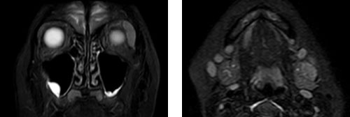 MRI所見においても両側顎下腺ならびに左側涙腺の腫脹が認められます。